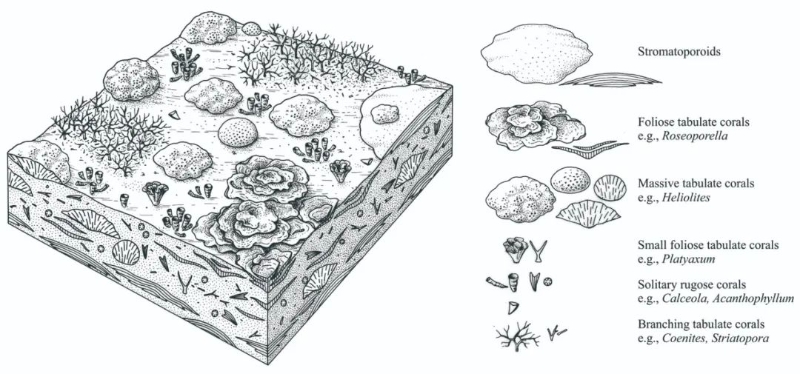 图6. 典型的泥盆纪中光带礁生态系统示意图,图源:Zapalski et al., 2021。